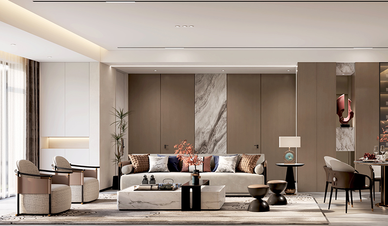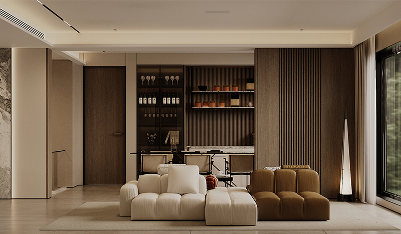說明:設(shè)計(jì)將功能容于形式,通過一組雙面模塊沙發(fā)分離客餐廳與水吧區(qū),重新解構(gòu)公共區(qū)域的內(nèi)部空間關(guān)系,使得整個(gè)場景不再呆板。 大落地窗引進(jìn)天光,加之材質(zhì)的入場達(dá)到明與暗的平衡,完成了整個(gè)空間場域氛圍的營造,實(shí)現(xiàn)生活場景的流暢轉(zhuǎn)場。