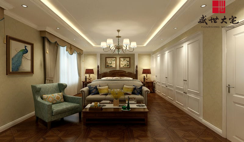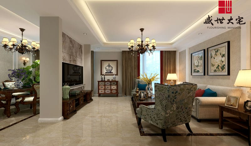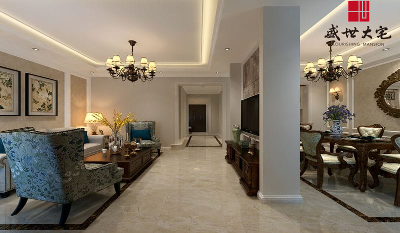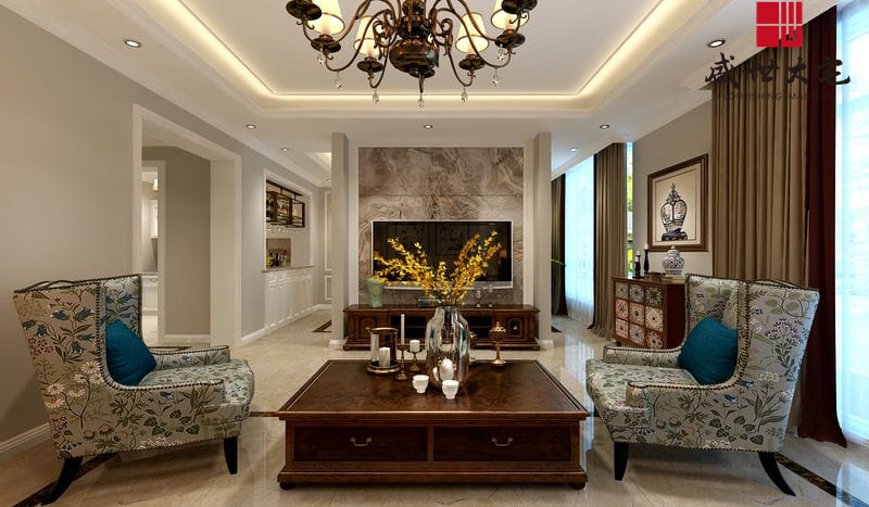 3、客廳以淺色系為主基調(diào),精選石材電視背景墻,粗獷且極具美式味道,與復(fù)古電視柜相結(jié)合,搭配著白色石膏的天花和門套,更顯純凈自然,墻面造型線條體現(xiàn)立體空間感。