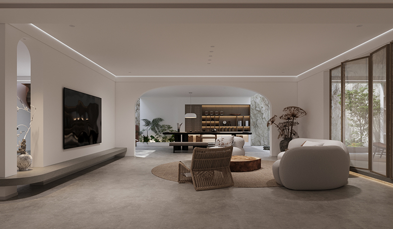 通過對傳統(tǒng)文化的認識,將現(xiàn)代元素和傳統(tǒng)元素結(jié)合在一起,以現(xiàn)代人的審美需求來打造富有傳統(tǒng)韻味的事物,讓傳統(tǒng)藝術在當今社會得到合適的體現(xiàn)在此案例中,門廳采用中式屏風的裝飾分割,使空間更加靈活。開放式的廚房,最大限度提升的業(yè)主對生活的熱愛和創(chuàng)想。采用大挑空的設計手法,讓空間無線延伸。令景色盡收眼底。地下層的禪意空間更具品味與自然,沿用古色古香的中式元素和簡單素雅的現(xiàn)代線條自然銜接,設計上令空間的現(xiàn)代氣息與東方韻味共存且維持平衡,打造質(zhì)感十足的室內(nèi)氛圍。