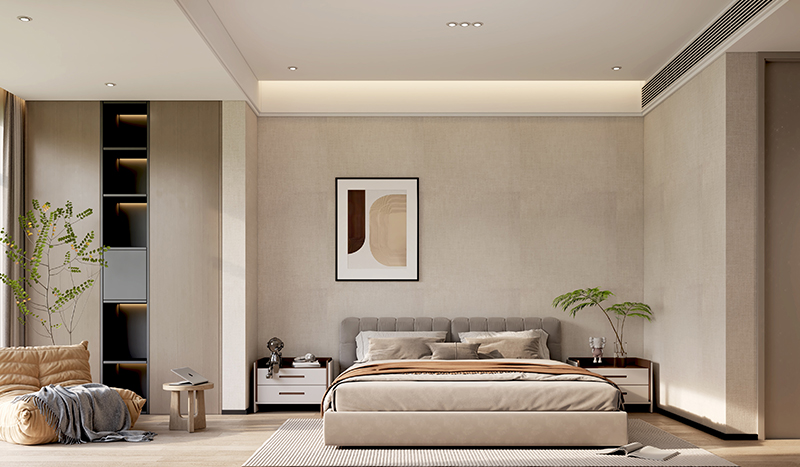 臥室空間相對(duì)緊湊,摒棄了多余的裝飾,以邊緣處嵌入式衣柜滿足收納需求,中央擺放著高級(jí)的床品。棚面和柜子之間巧妙安置的燈帶,為空間增添了溫馨的氛圍