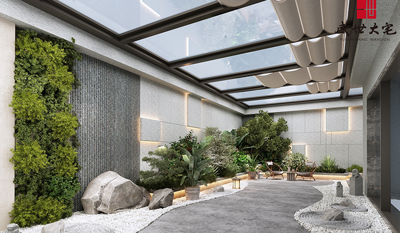 負(fù)一層的天井花園曲徑通幽,漫步于小徑之上,滿目的蒼翠蔥綠,如詩如畫,恍若誤入一處室外桃源之地。暖色的地?zé)?,宛若墜入人間的月光寶盒,為靜謐時光注入屢屢溫度。向上仰望,采光玻璃引入天光云影和四時變化,給地下空間帶來充足的采光,用來遮光的百葉則由微微卷翹的弧形飾片疊合而成,片片相連,將天空裁剪成獨特的形狀。