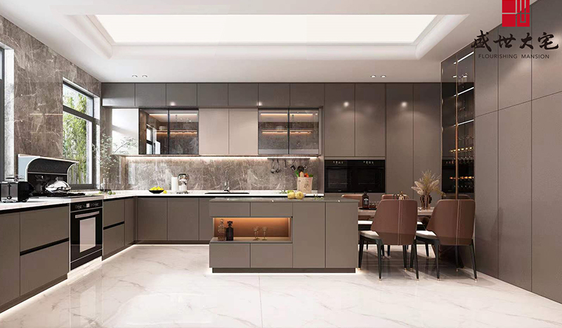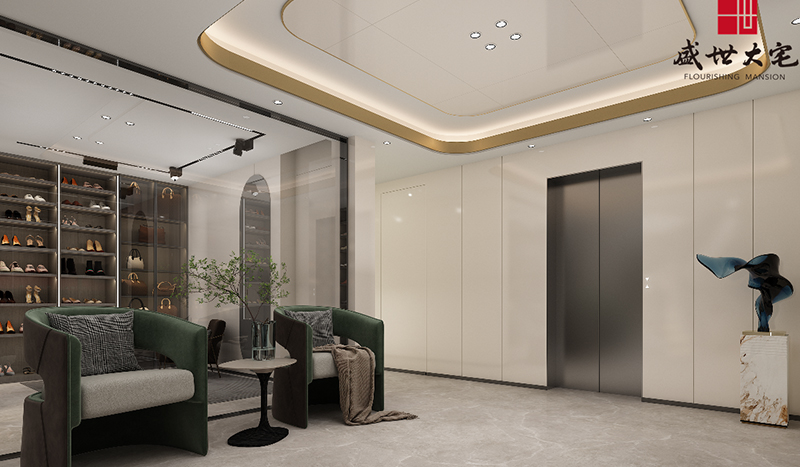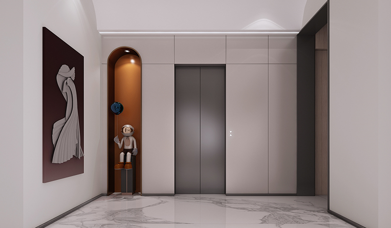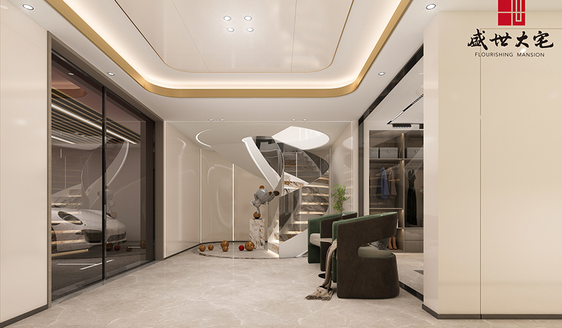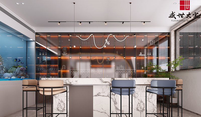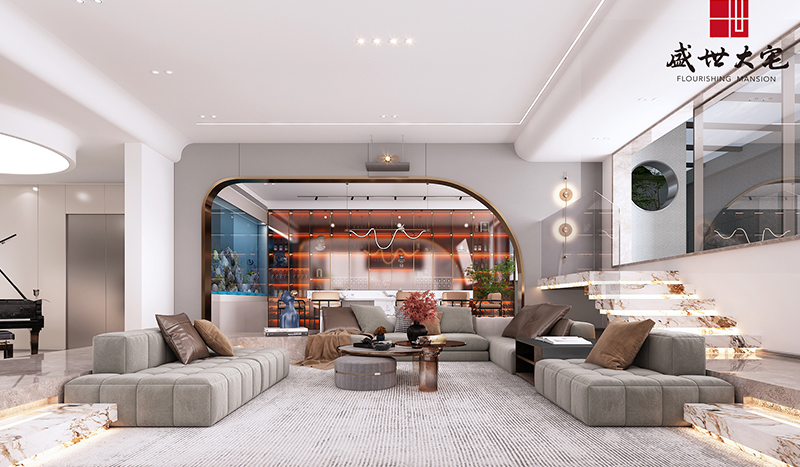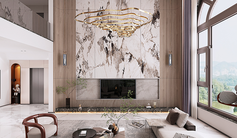 一層客廳鋪陳闊別大氣的序曲,超大視野的落地窗將室外的自然景色引入室內(nèi)。建筑本來就是大自然的一部分。借由渾河“婉曲”的靈感創(chuàng)作的藝術(shù)燈飾,是挑空客廳恢宏中的一抹嫵媚,金屬質(zhì)感閃著純美的光澤,以自由蜿蜒的姿態(tài)盤旋與半空之中,與峰巒起伏的大理石背景墻相得益彰,構(gòu)筑出一副絕美的山水畫卷。動與靜、剛與柔、虛與實,設(shè)計以藝術(shù)喚醒感知,直抵生活的本真與自在。