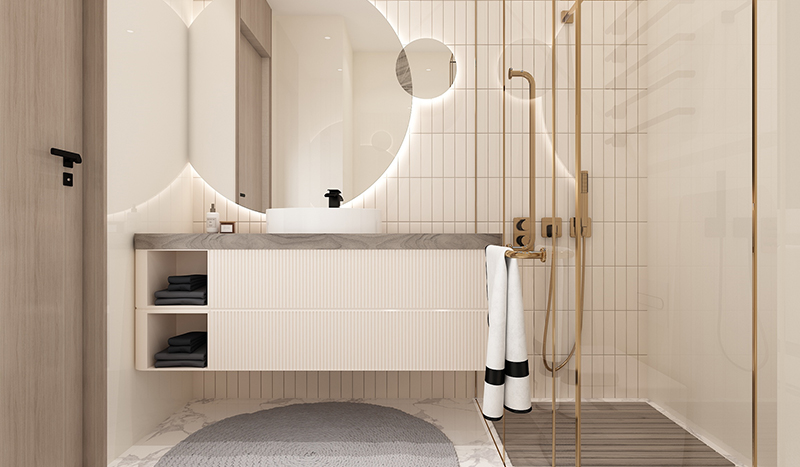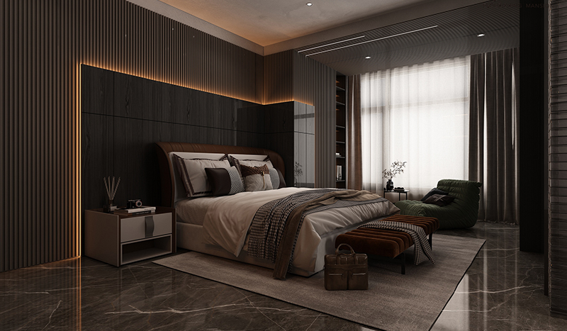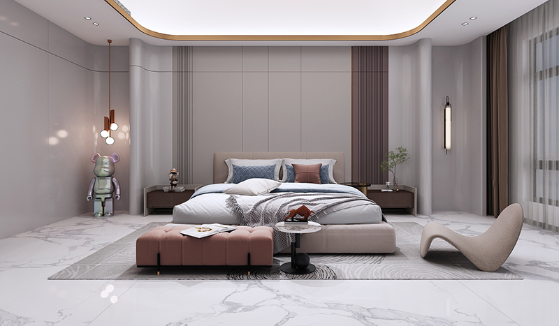 二層臥室大量運用墻板不同造型劃分不同層次,細(xì)膩藏于線條之中,現(xiàn)代家具的色澤與質(zhì)感共同營造適合睡眠的氛圍,玻璃磚讓空間有了通透性,跳躍顏色的軟裝搭配讓空間更靈動。