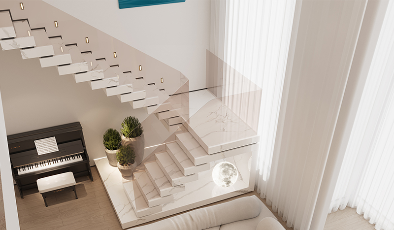 客廳區(qū)域的硬裝部分采用大規(guī)模的留白簡(jiǎn)化處理,具有硬朗的線條感,與軟裝部分采用異形沙發(fā)及各種造型靈動(dòng)的家具形成對(duì)比,點(diǎn)綴色彩鮮艷的地毯使整體家居具有呼吸感,樓梯踏步采用天然石材,搭配月球燈與綠植,輕盈靈動(dòng)的突出樓梯下方的獨(dú)特景致