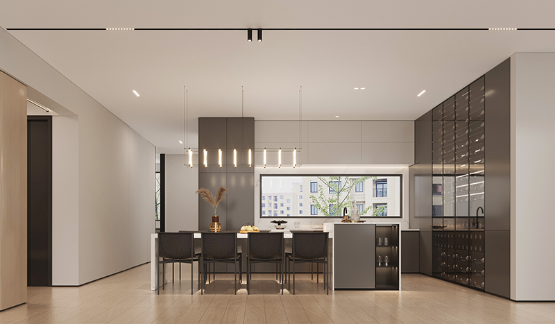 開放式餐廳區(qū)域同樣采用了簡(jiǎn)潔的造型,給人強(qiáng)烈的現(xiàn)代感,櫥柜統(tǒng)一高級(jí)灰無把手柜門,蒸烤箱疊放,收納柜及冰箱的內(nèi)嵌定制,兼具實(shí)用性與美觀性,讓整個(gè)廚房空間有更多可能
