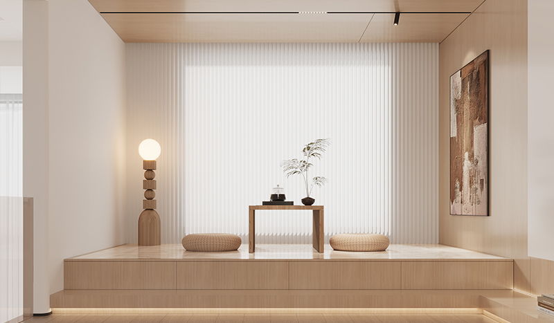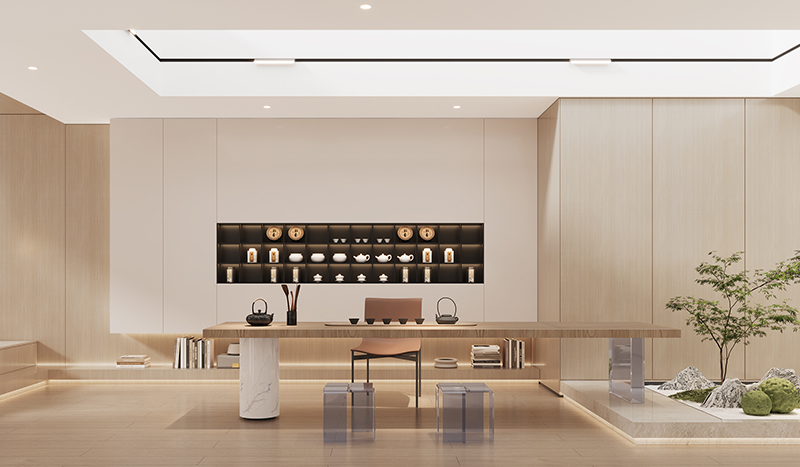 茶室是一個(gè)安放心靈的空間,所以設(shè)計(jì)上以簡(jiǎn)約自然舒適為主,寧?kù)o的空間搭配綠色的小景觀釋放一種素雅靜謐的空間氣質(zhì),也為生活更添加了許多禪意和悠閑,木色臺(tái)面的質(zhì)感與亞克力桌腿賦予了空間清雅自然的活力感