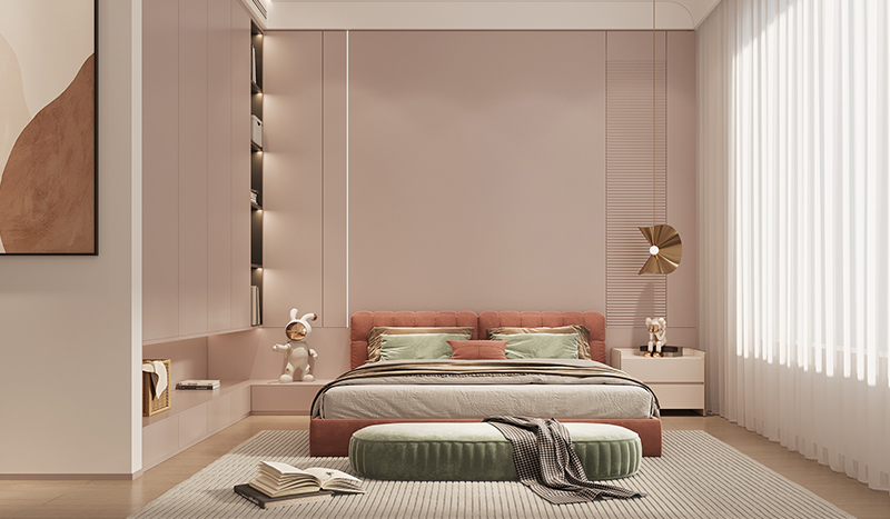兒童房用粉色圓潤(rùn)的床營(yíng)造出可愛的氛圍,可愛的吊燈及擺件元素增添童趣感,整體色調(diào)采用低飽和的莫蘭迪色系,營(yíng)造舒適而溫馨的氛圍感,弧形棚面與內(nèi)嵌燈帶的加入讓空間的層次感更加豐富