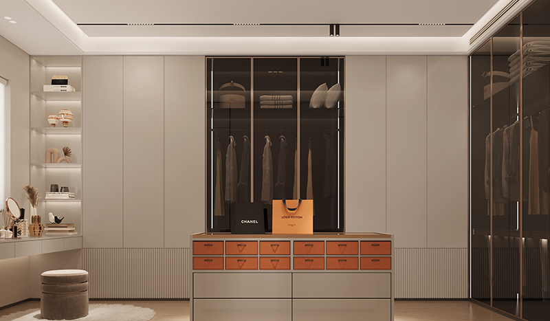 衣帽間的一抹橙色點(diǎn)亮了空間,盡顯優(yōu)雅高級(jí)感,精致的工藝強(qiáng)調(diào)出細(xì)節(jié),原木地板配上一張柔軟的地毯,兼具美觀和實(shí)用