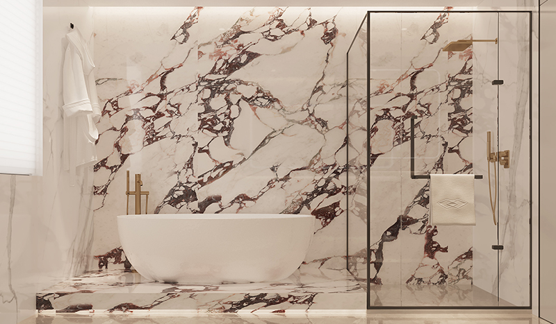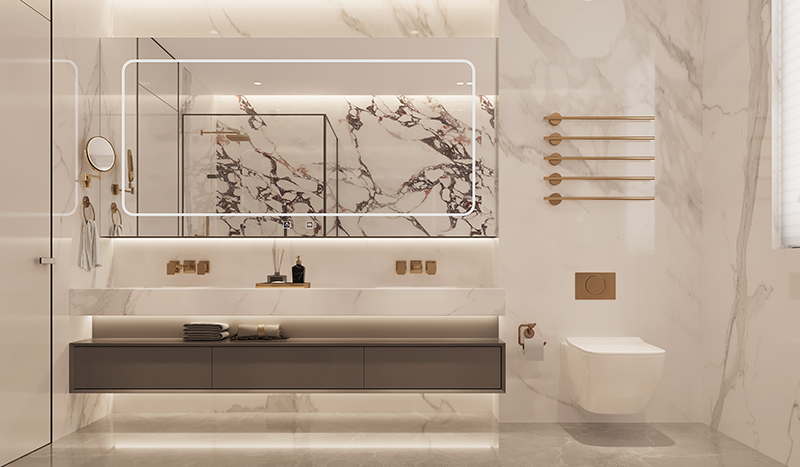 衛(wèi)生間的奢石背景墻加暗藏?zé)魩В举|(zhì)浴室柜細(xì)與金屬潔具的碰撞,讓空間看上去純粹極簡(jiǎn),提升空間的整體質(zhì)感,充分展現(xiàn)了居住者對(duì)于生活的美好追求