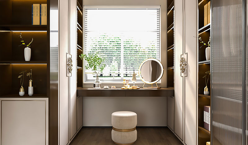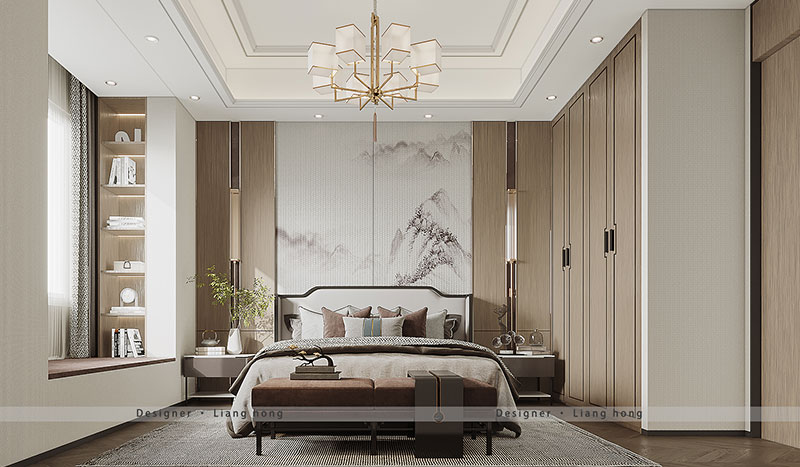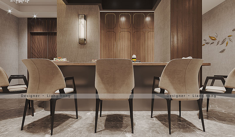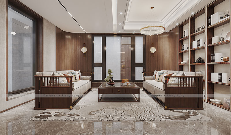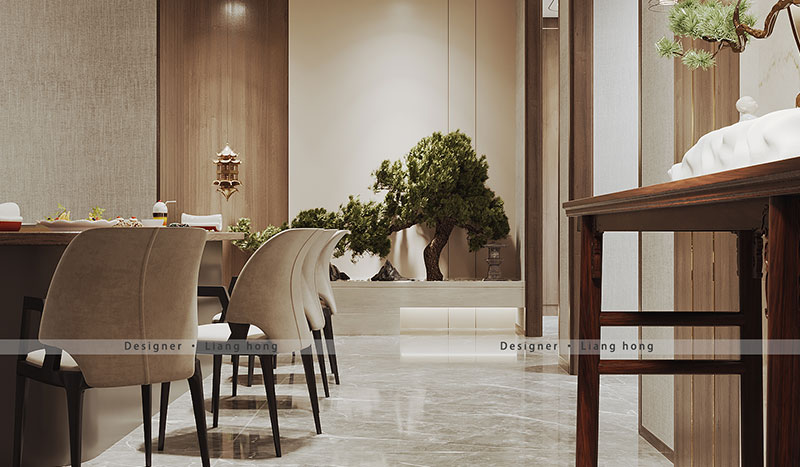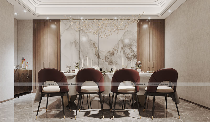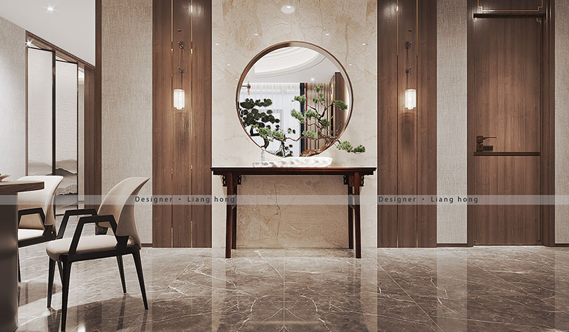 中式邂逅現(xiàn)代,空間內(nèi)運(yùn)用開放式布局,增加視野寬闊感,且富于更多通透度。另外應(yīng)用大面積木制家具布置其中,巧妙的襯托出一種傳統(tǒng)古韻且夾雜書香氣的氛圍。局部采用酒紅色做點(diǎn)綴,酒紅色的高貴和優(yōu)雅足以詮釋整個(gè)空間內(nèi)的典雅氣質(zhì),再將白色、木色與之搭配,就好似心靈有了依靠,給人以直擊心靈的溫暖力量。中國紅再對(duì)稱的空間布局之中,顯得格外耀眼,是獨(dú)一份的驕傲。