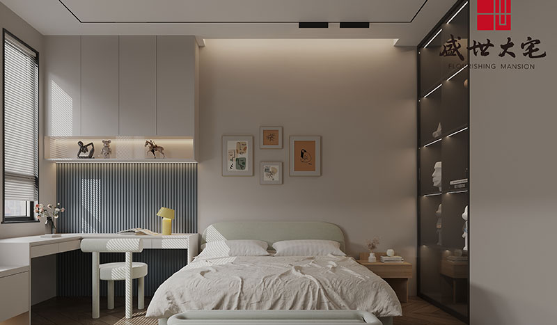 二樓上樓梯處以懸浮柜體作為隔斷,與墻面分離,做出層次。起居室以收納,閱讀為主。主臥以墻板硬包作為裝飾,兩個(gè)男孩房盡量不做過(guò)多修飾,房間都以簡(jiǎn)潔明快位主。