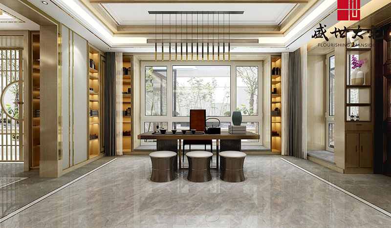 負(fù)一層空間重新布局,利用自然光角度,布置地下室。本層為業(yè)主功能區(qū),會客廳采用了寬闊的東方雅韻客廳,步入客廳,簡約的大理石地磚彰顯雅致中式的大氣,客廳背景中墻面的山間畫卷背景讓人舒心。