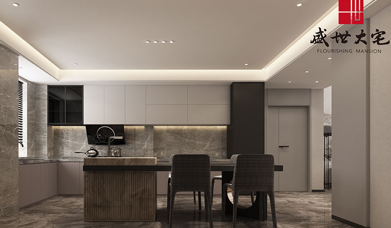餐廳島臺與餐桌結(jié)合,滿足多人聚餐空間,層次分明,現(xiàn)代氛圍盡顯,家里人吃個甜點(diǎn),聊聊家常,舒適愜意