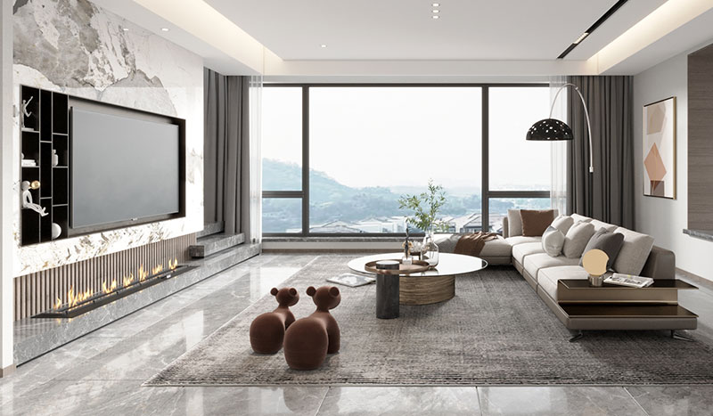 客廳區(qū)域硬裝部分簡約,墻面及地面大面積留白或簡化處理,背景墻與飄窗采用不同材質(zhì)和造型的組合,呈現(xiàn)繁簡對(duì)比,電視背景與樓梯融為一體,將空間整體為一.