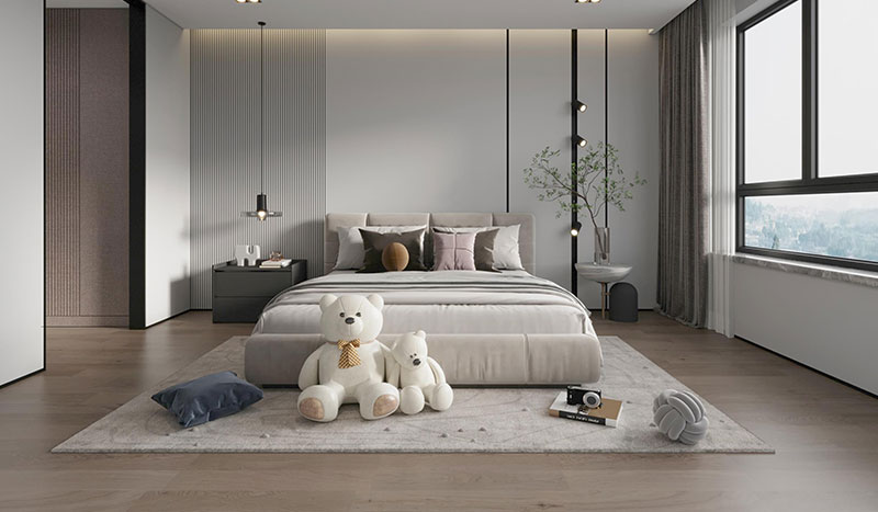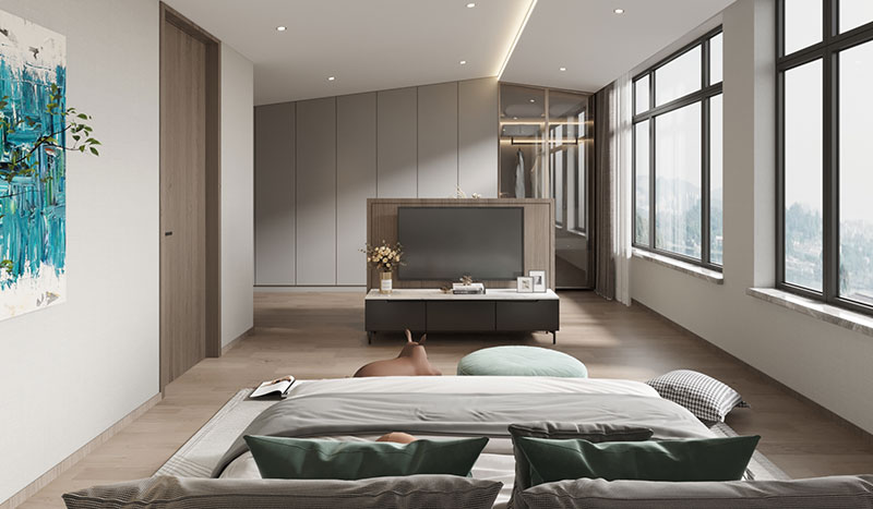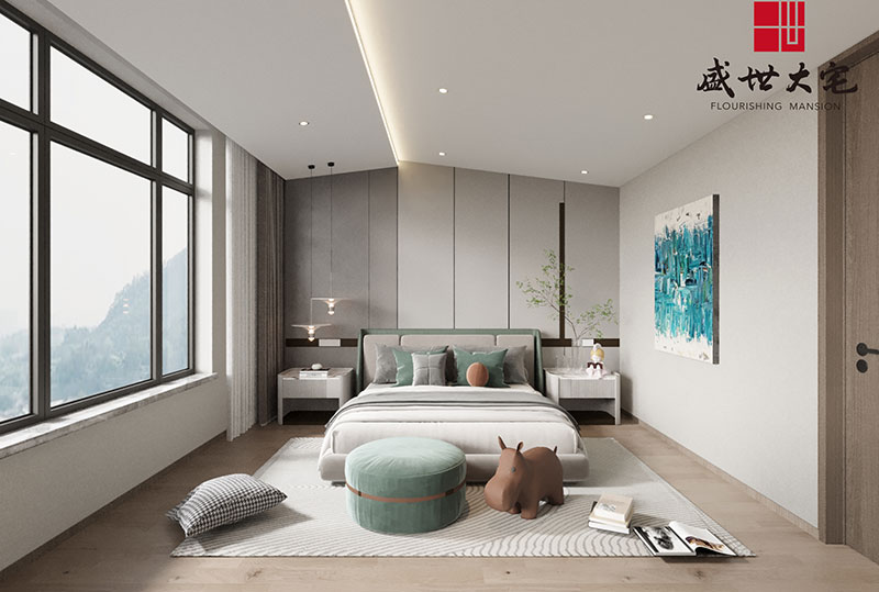 主臥顏色暖色為主,局部跳色,活潑不凸顯