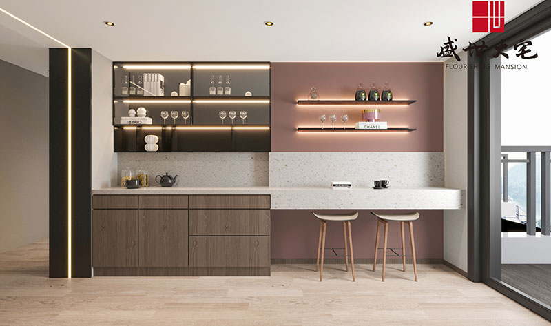 餐島一體,與餐邊柜的裝飾品前后錯(cuò)落,層次分明,一眼望去,幸福且滿足