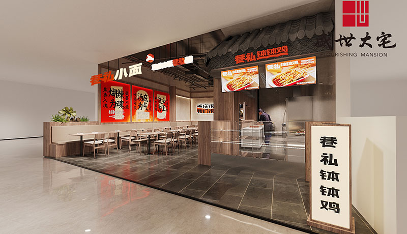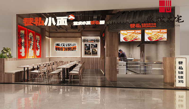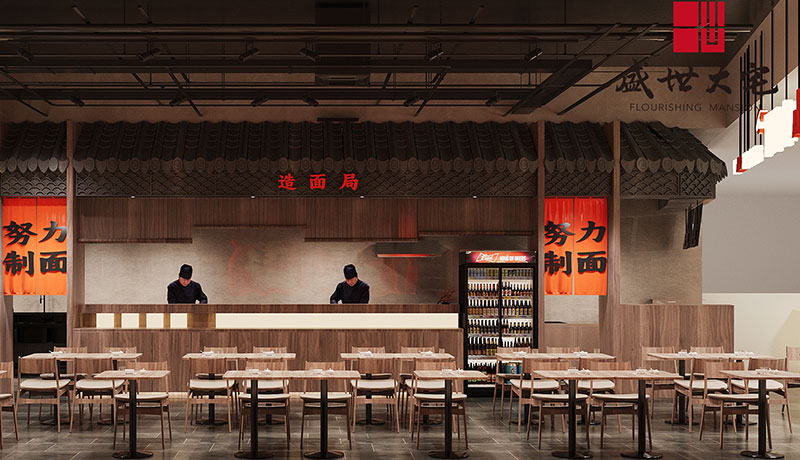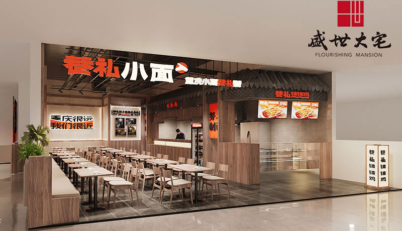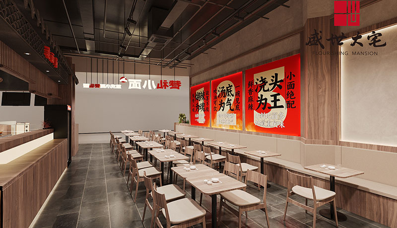 在設(shè)計(jì)構(gòu)思上,面館的外部造型和內(nèi)部空間主要采用木飾面、藝術(shù)涂料等元素,呼應(yīng)面館的設(shè)計(jì)理念--重慶與時(shí)尚風(fēng)格的結(jié)合,創(chuàng)造既城市,建筑自然與人和諧共處的中間地帶的空間。